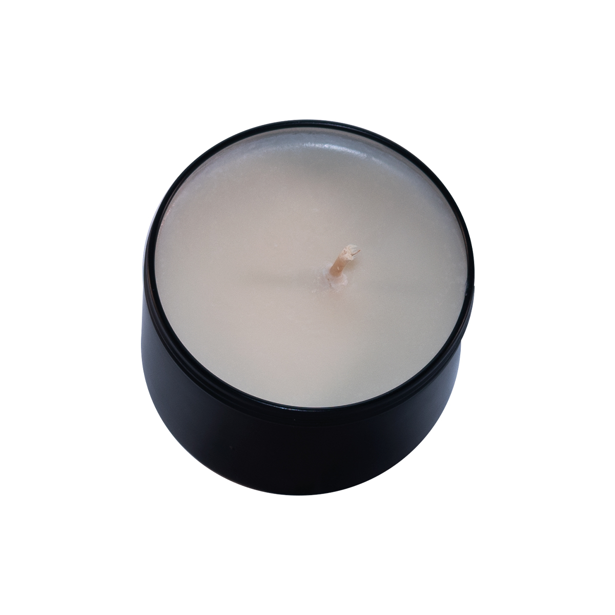 Vela artesanal de soya en contenedor metálico negro de 6 oz, con una mecha y aromas variados.