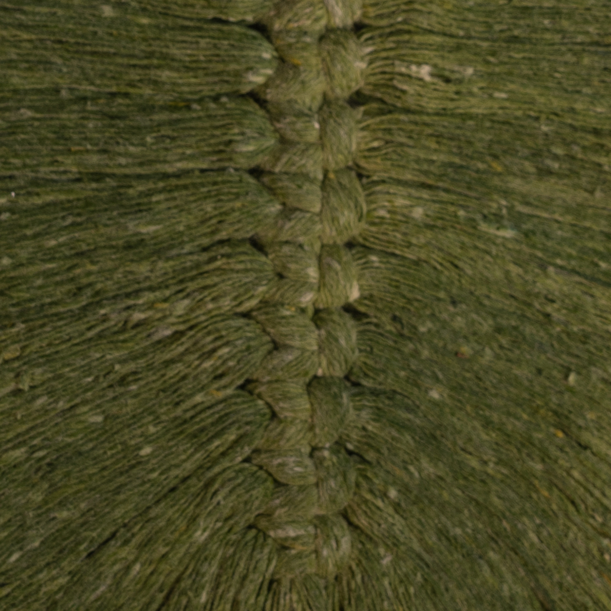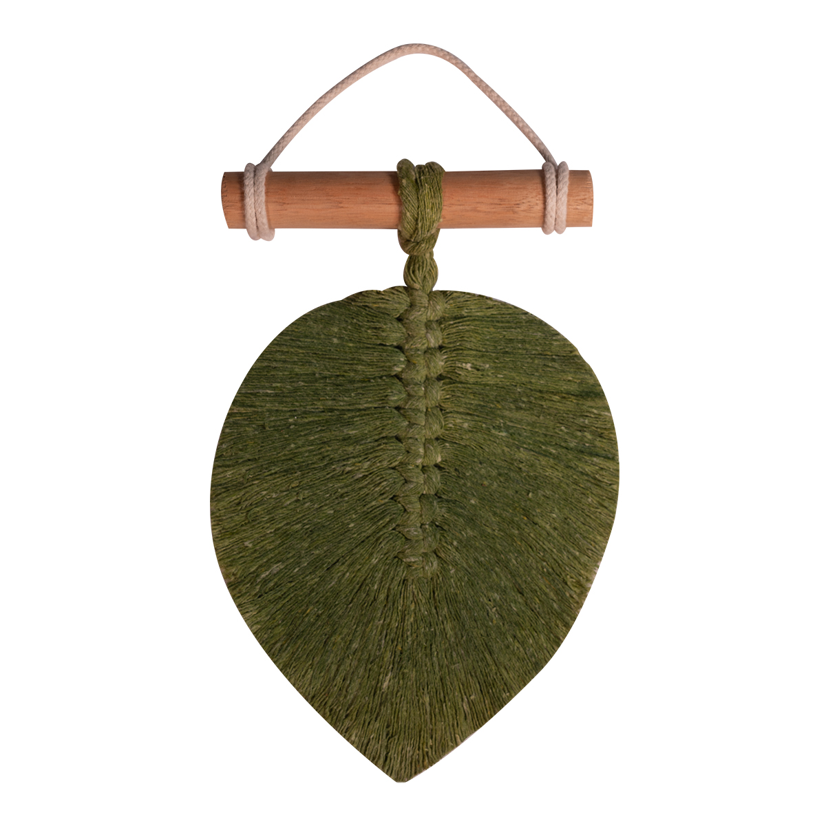 Hoja de macramé individual, hecha con hilo de algodón y cabo de madera.