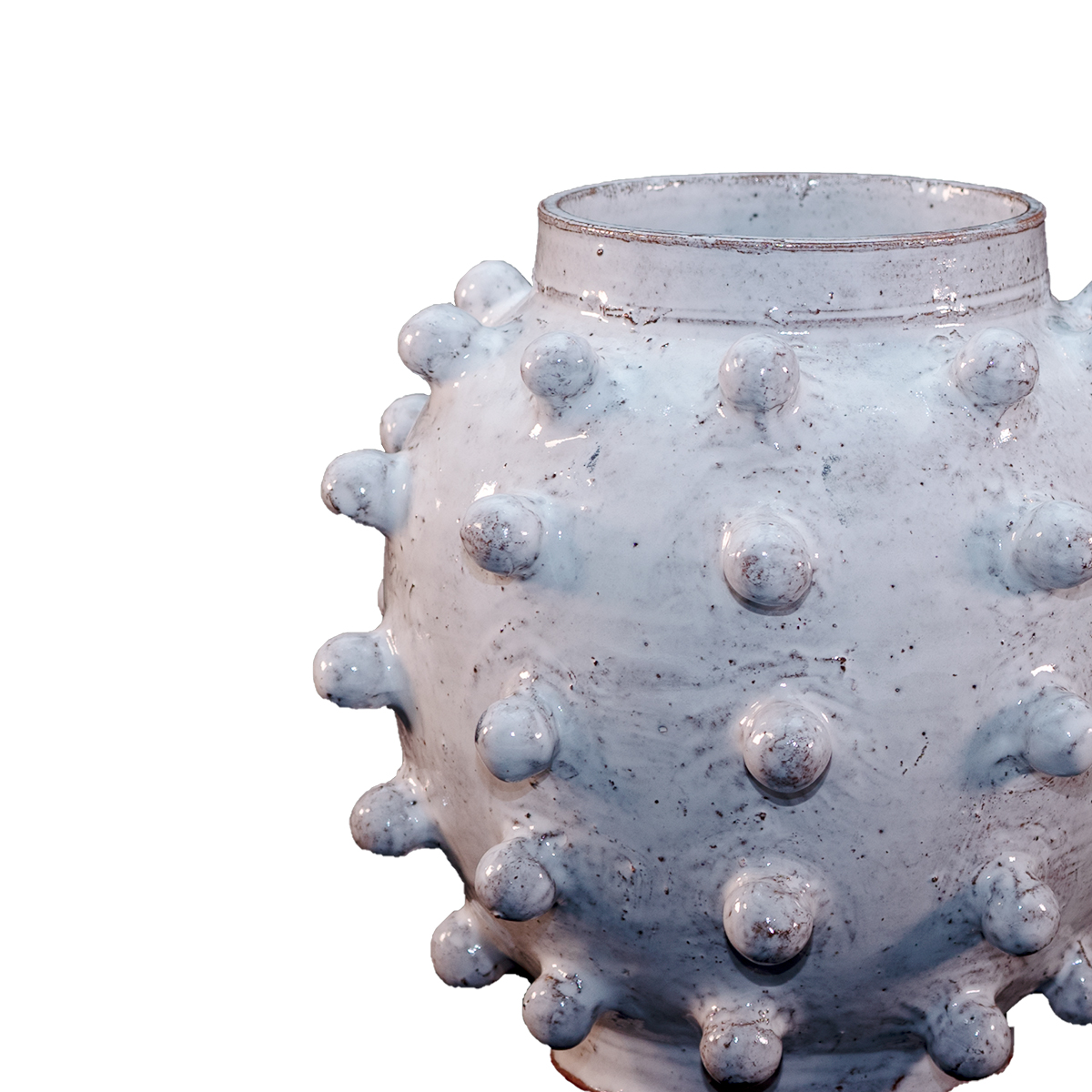 El Florero de Cerámica Paola M es una pieza artesanal hondureña que destaca por su diseño contemporáneo y su textura inusual de pequeñas esferas que lo envuelven en todo su contorno. Su acabado en blanco neutro le aporta elegancia y versatilidad, permitiendo que encaje en espacios minimalistas, modernos o eclécticos.