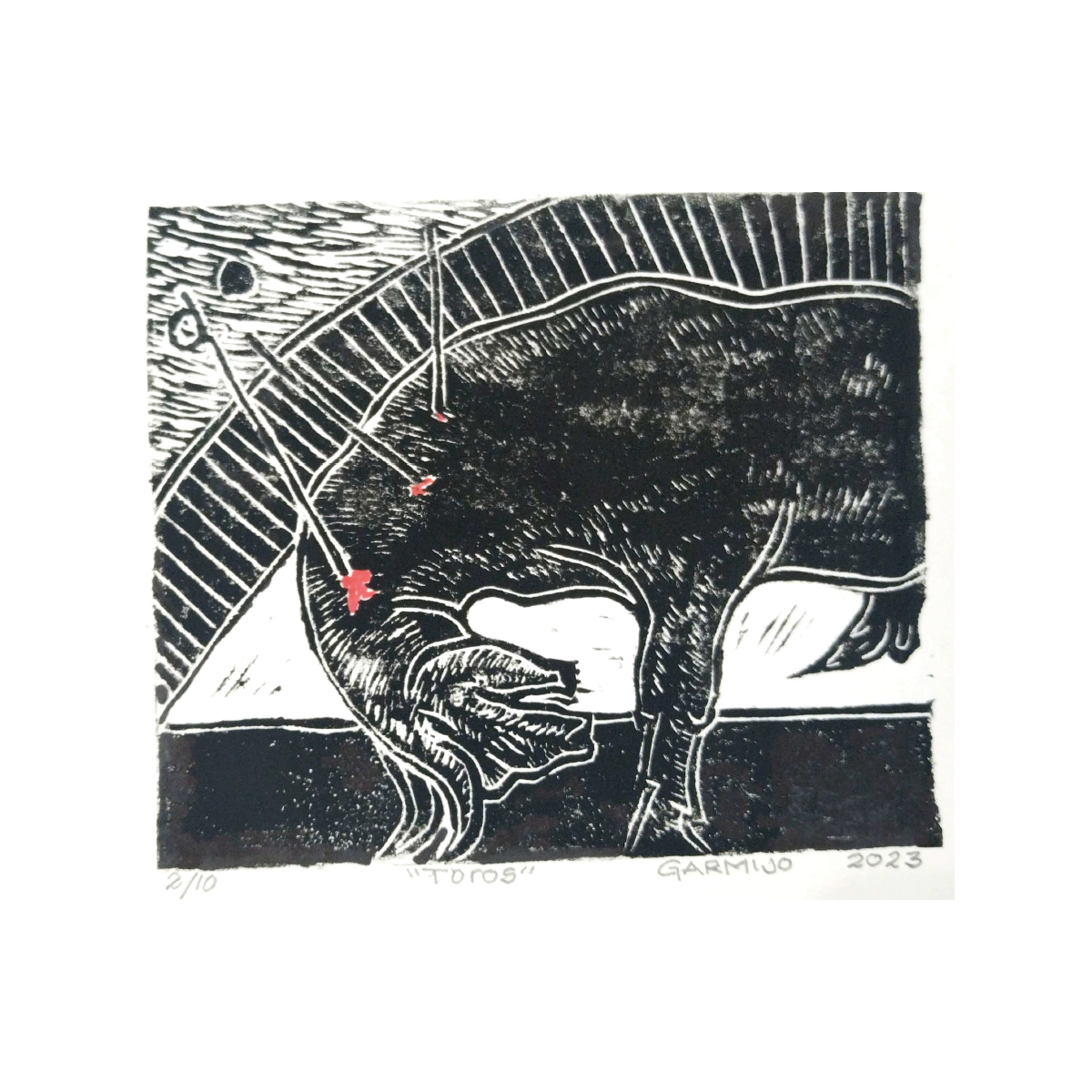 “Toros” es un grabado en linóleo que captura, con trazos firmes y contrastes profundos, el dramatismo visceral de una escena taurina.