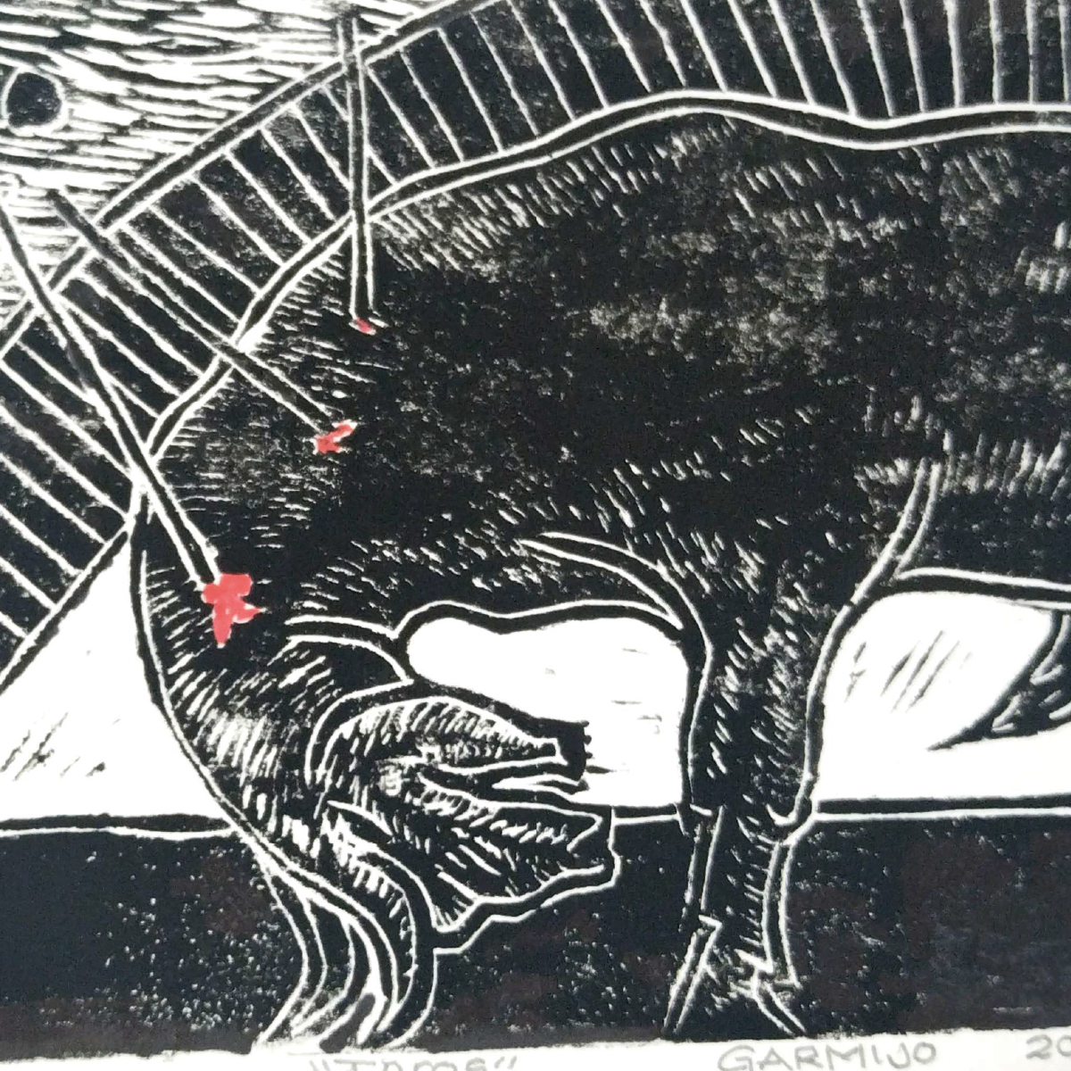 Grabado en linóleo que retrata la fuerza, el dramatismo y la intensidad simbólica de un toro en plena lucha, con un estilo crudo y expresivo.