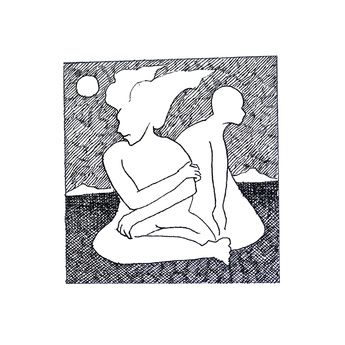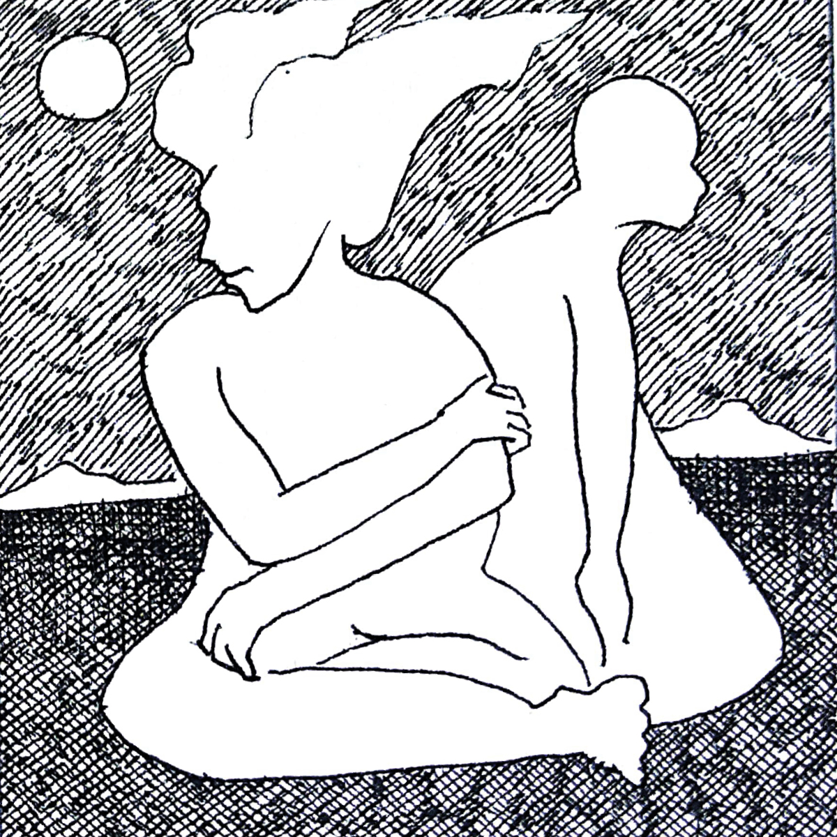 Dibujo en tinta sobre papel que muestra dos figuras femeninas entrelazadas en una composición íntima y contemplativa.