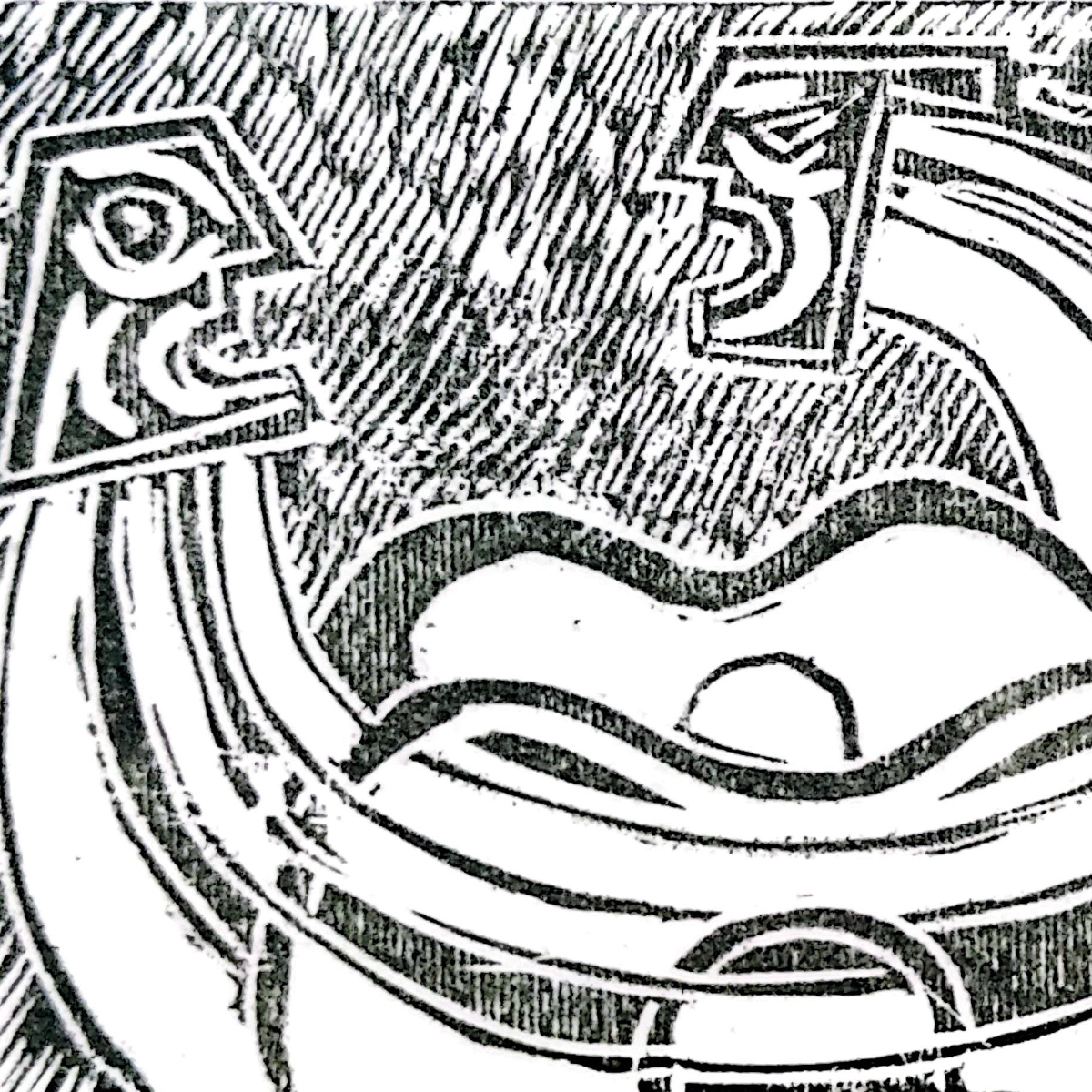 Grabado expresivo de guitarras en movimiento, que celebra el ritmo y la textura.