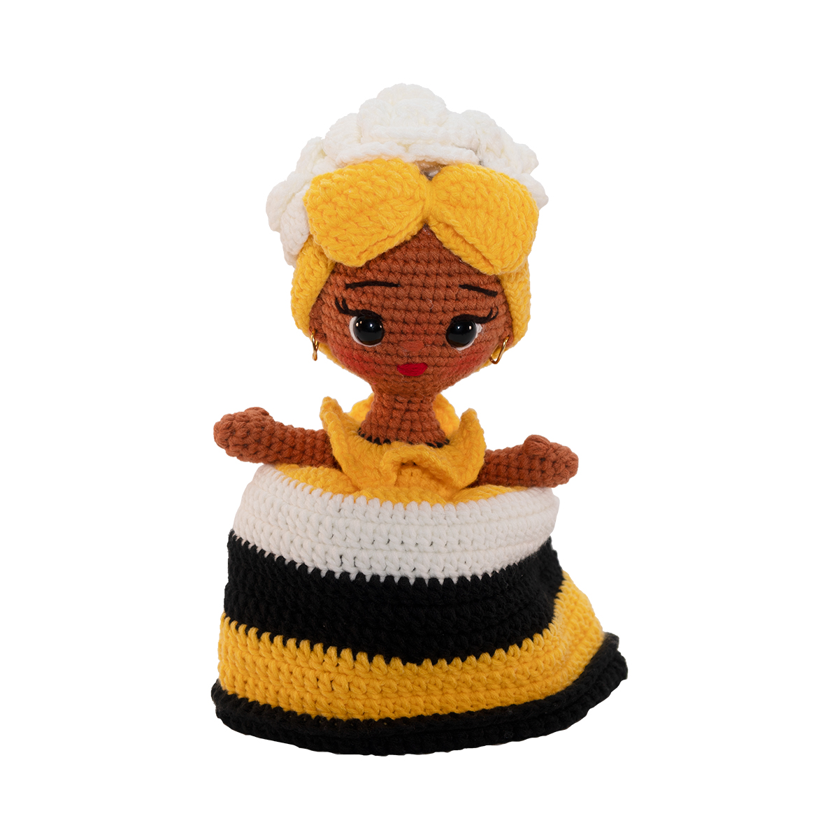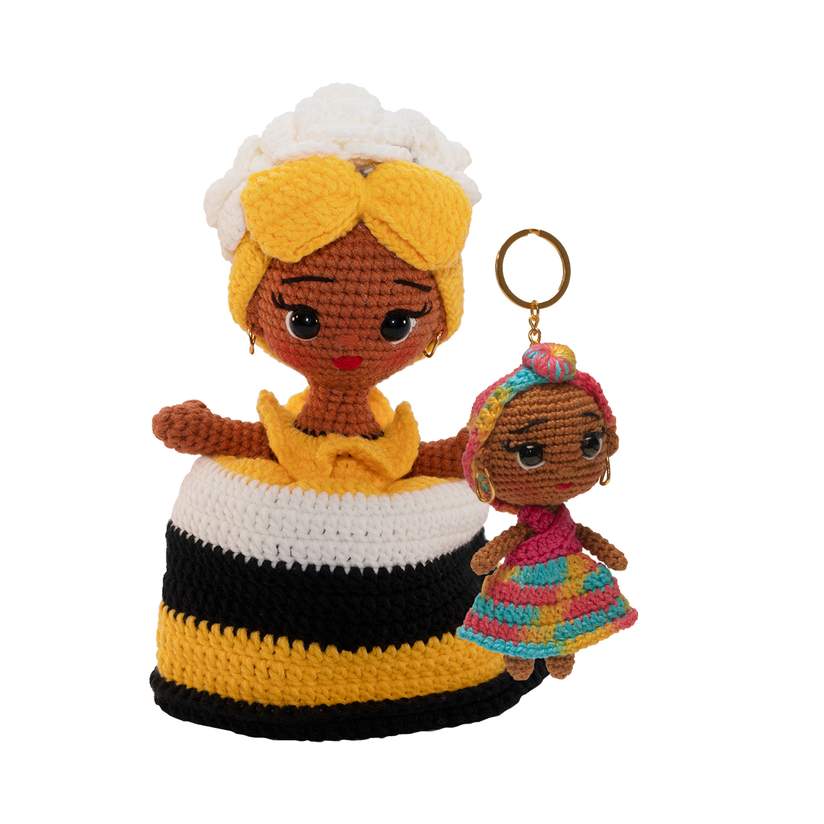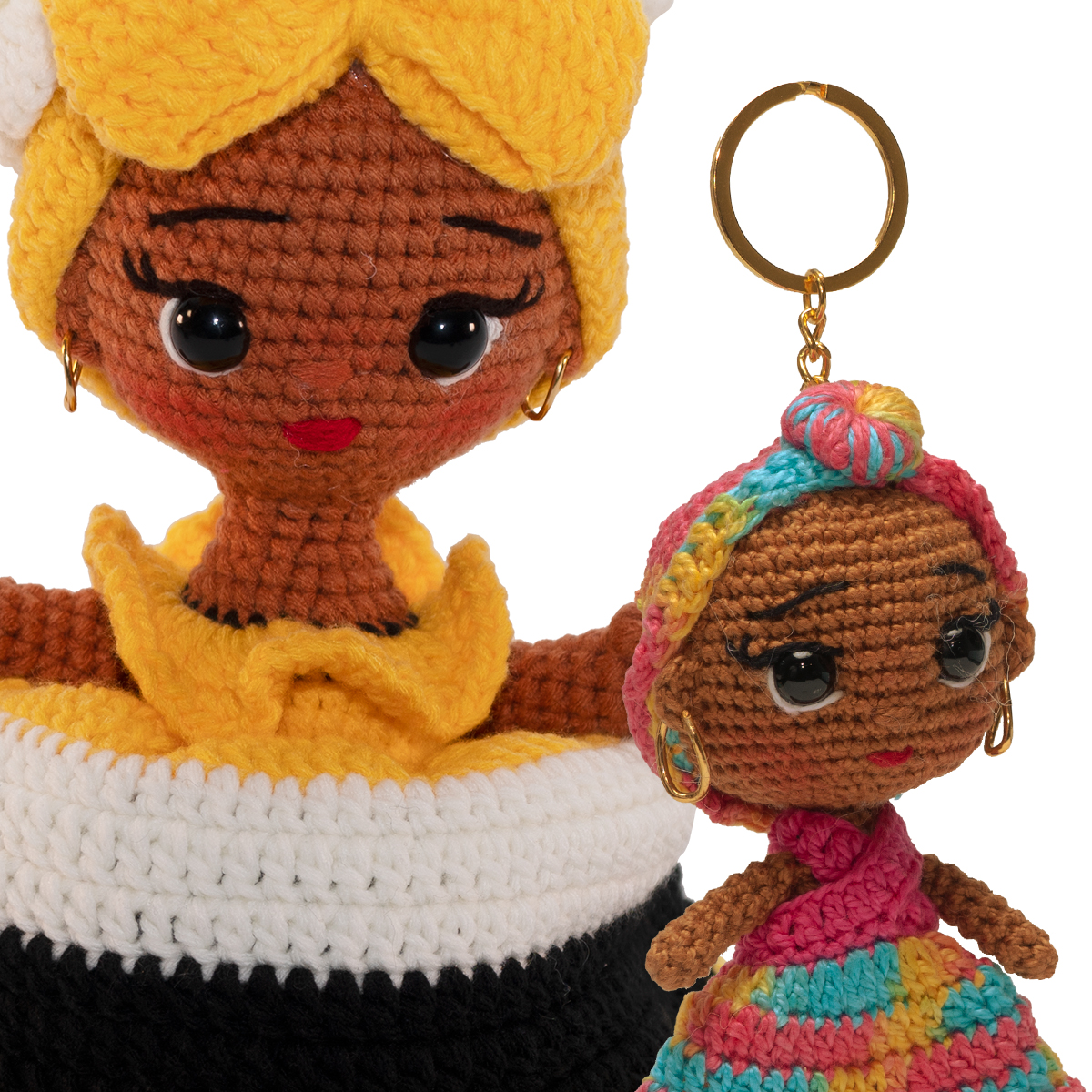 Esta muñeca amigurumi, tejida a mano con maestría, representa la fuerza y belleza de la cultura garífuna en Honduras. Sus colores amarillo, blanco y negro evocan la vitalidad del sol, la pureza del mar y la profundidad de la tierra, símbolos presentes en la identidad de este pueblo afrodescendiente. El tocado elaborado y los detalles delicados reflejan la tradición y orgullo de generaciones que mantienen vivas sus raíces. Ideal como recuerdo cultural, pieza decorativa o regalo especial, cada muñeca es única y creada con dedicación por artesanos hondureños.