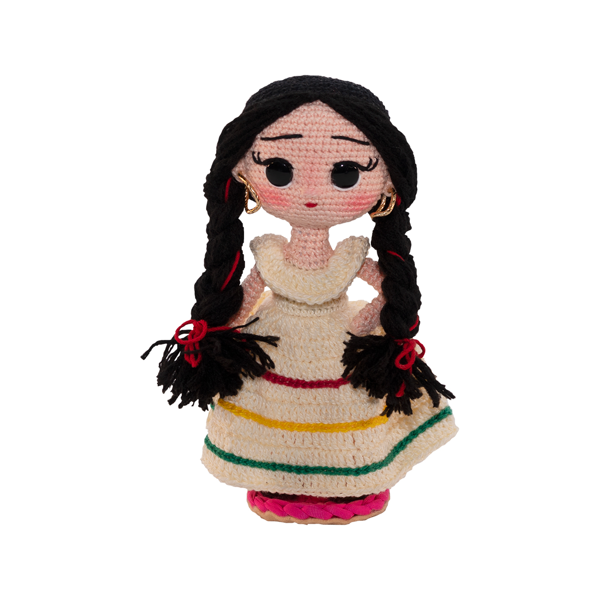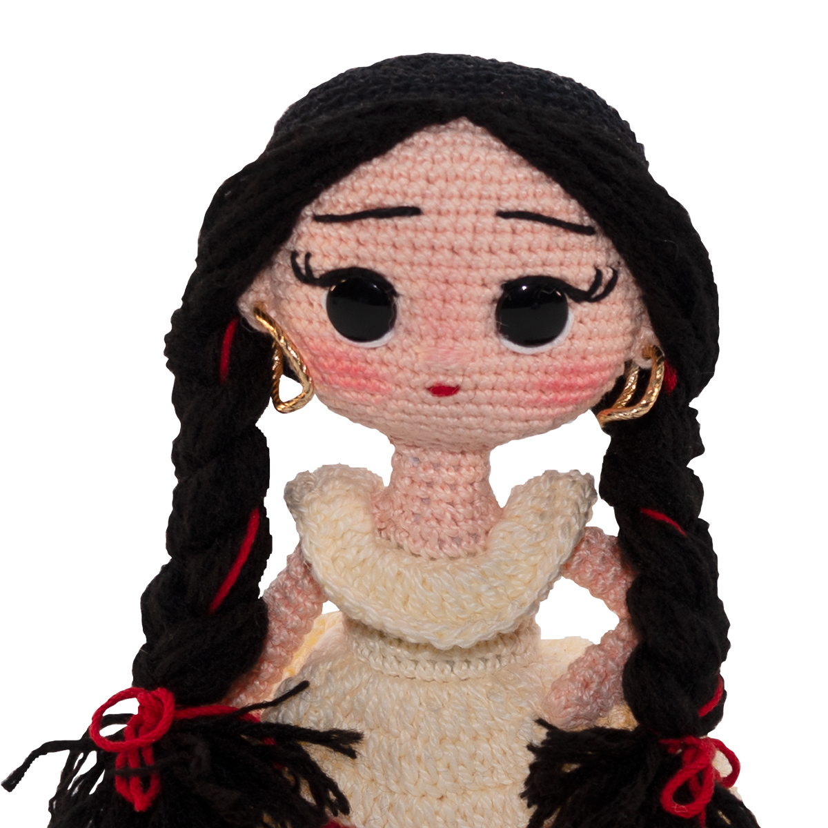 Muñeca artesanal de crochet con largas trenzas y vestido típico hondureño.