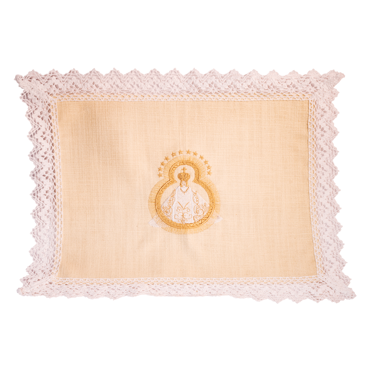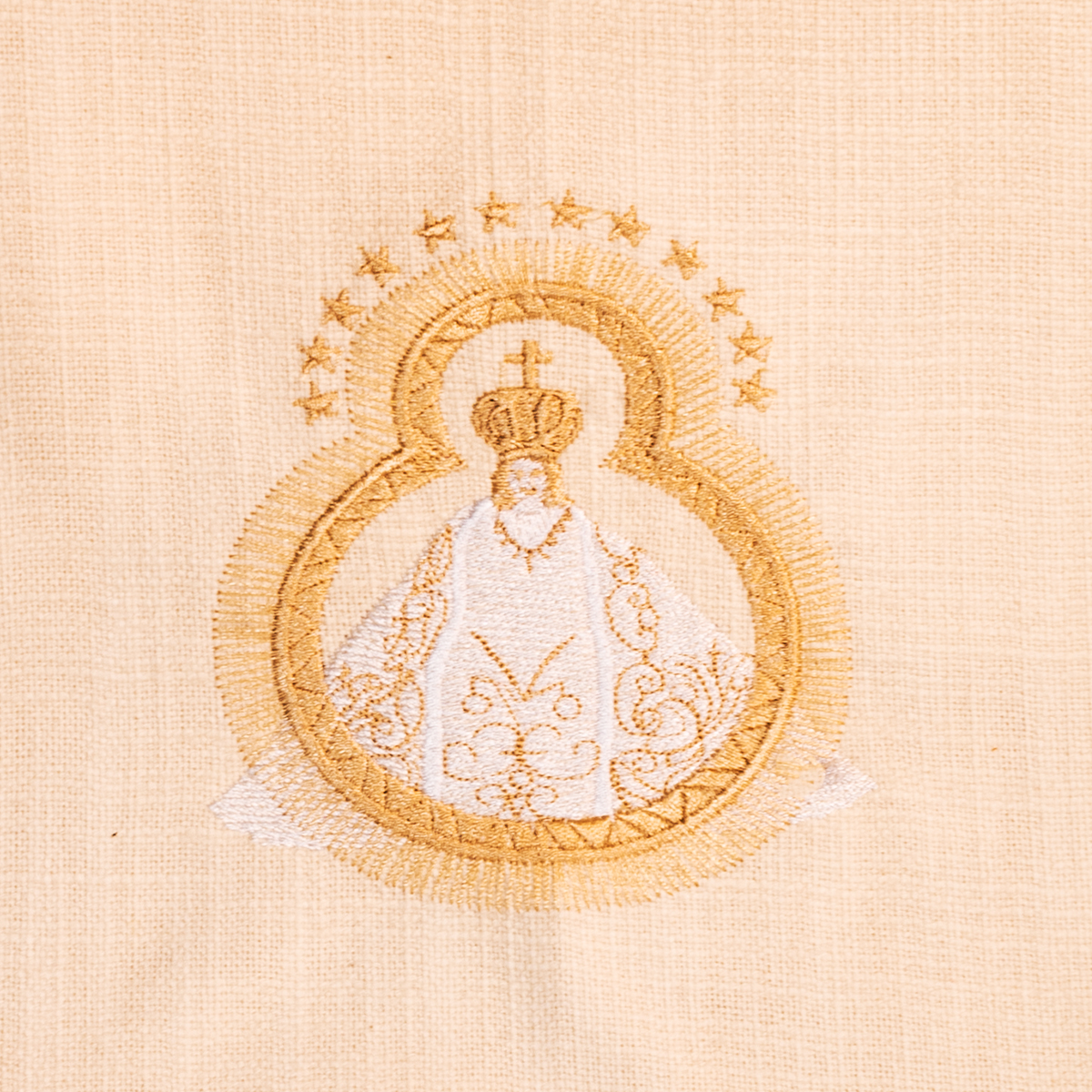 El Tapete con la Virgen de Suyapa es una pieza artesanal única que une tradición, devoción y belleza en cada detalle. Confeccionado en suave tela de algodón y delicadamente adornado con encaje, destaca en el centro un bordado de la Virgen de Suyapa, patrona de Honduras, símbolo de protección y fe.