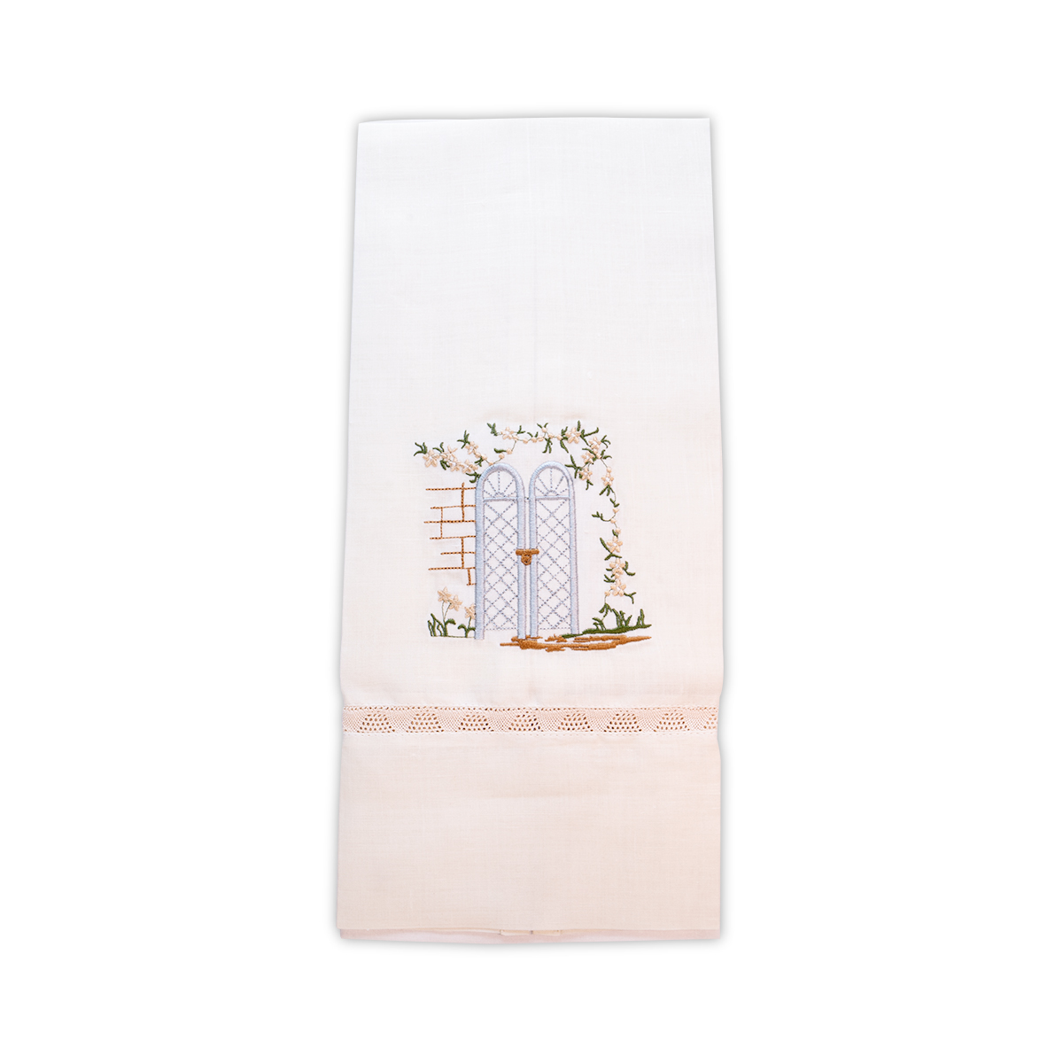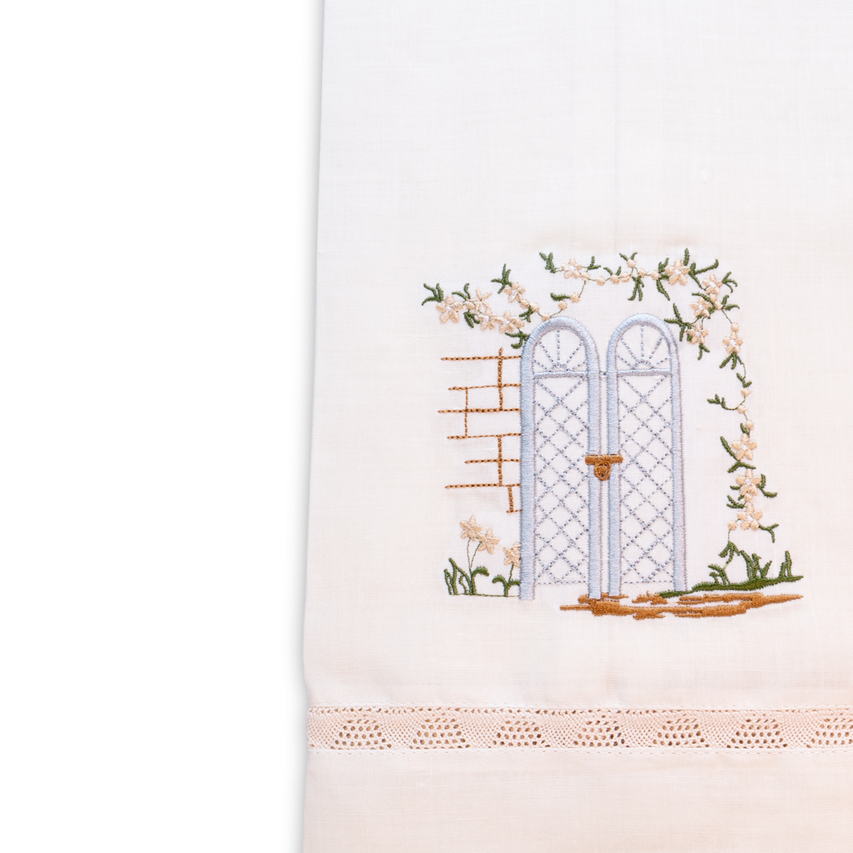 Manta de baño de linillo en algodón con delicado encaje y bordado a máquina, elegante y artesanal.