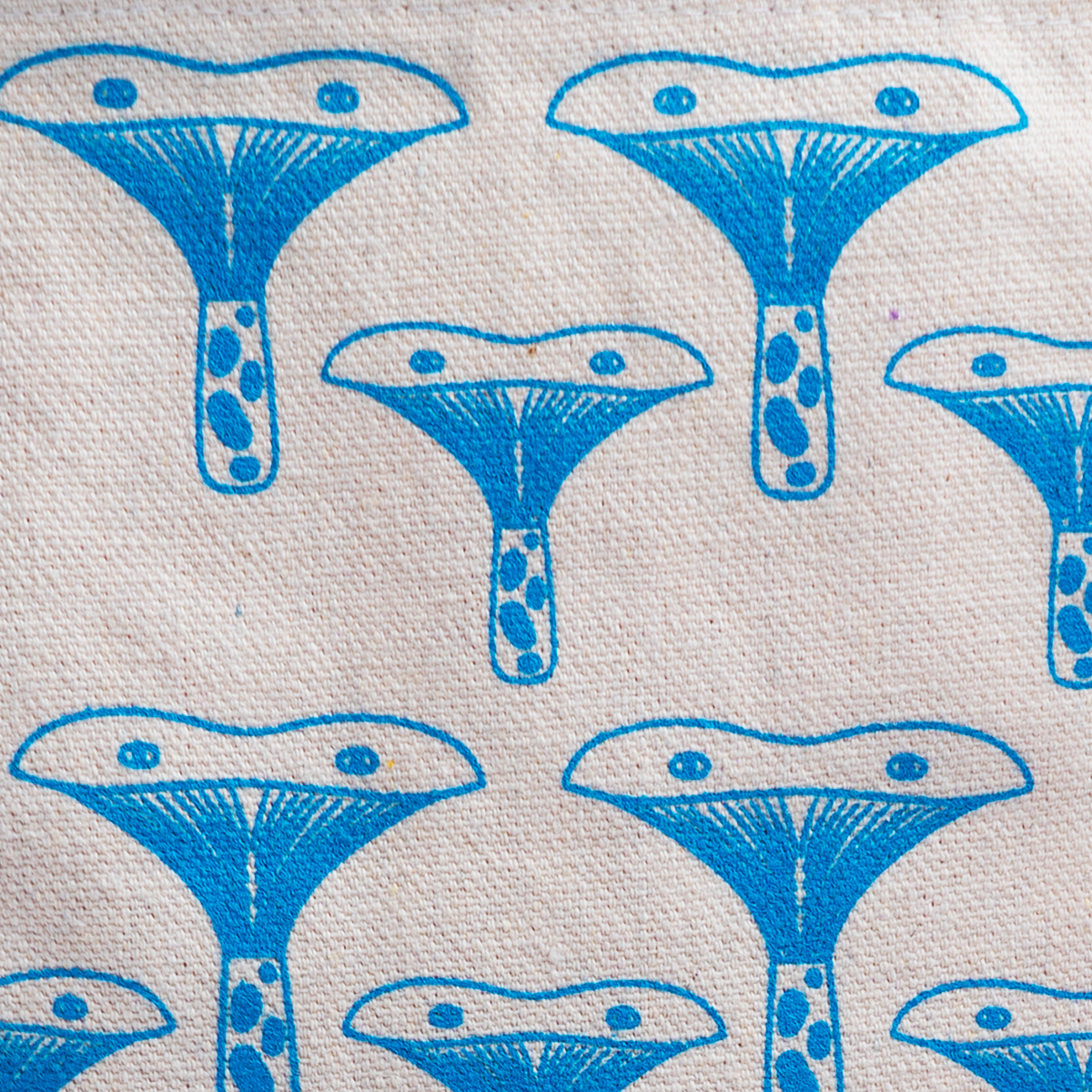 Cosmetiquera grande elaborada en Honduras, con estampado artesanal de hongos azules. Un diseño de GESTO que celebra la conexión con la naturaleza y el arte local.