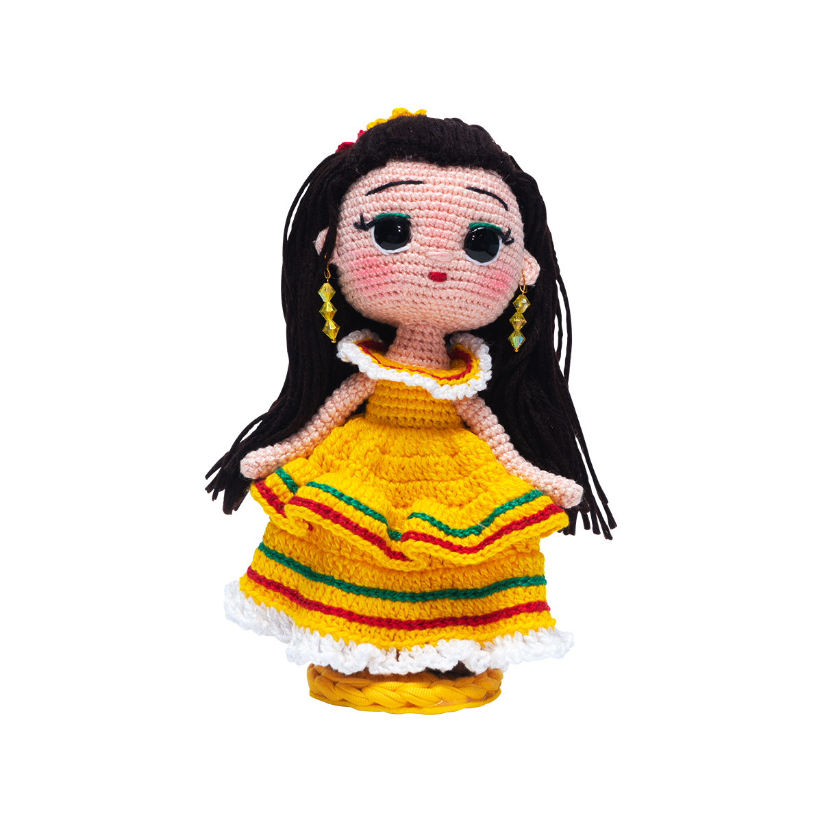 Cada muñeca está tejida a mano con delicadeza, luciendo un vestido amarillo con detalles coloridos inspirados en los trajes folklóricos típicos del país.
