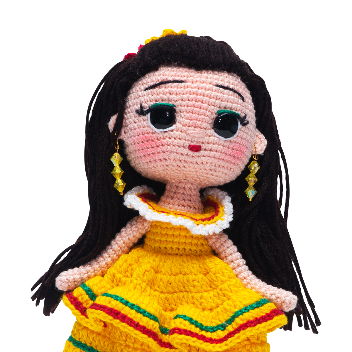 Muñeca típica hondureña tejida a mano en amigurumi, con vestido amarillo de inspiración folklórica.
