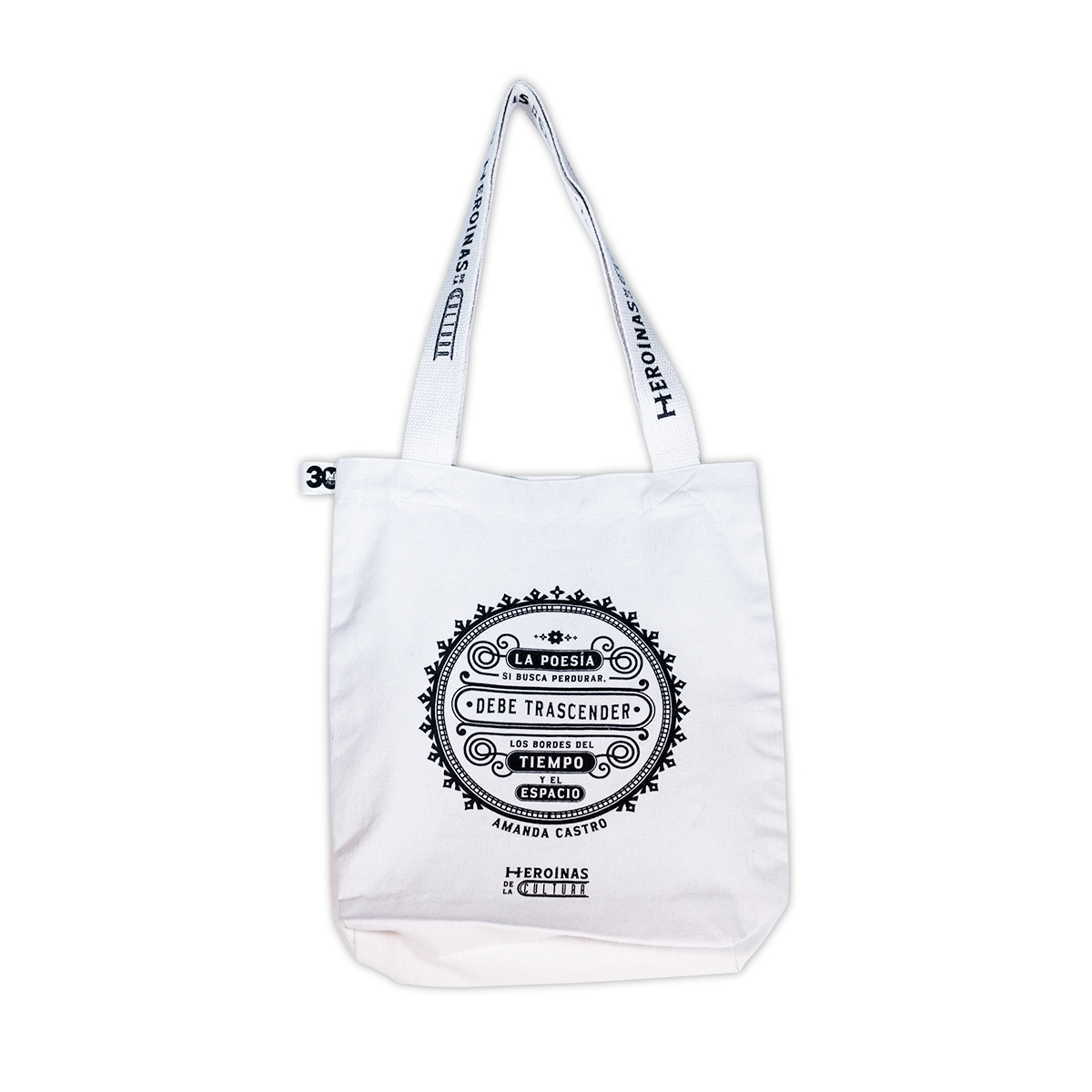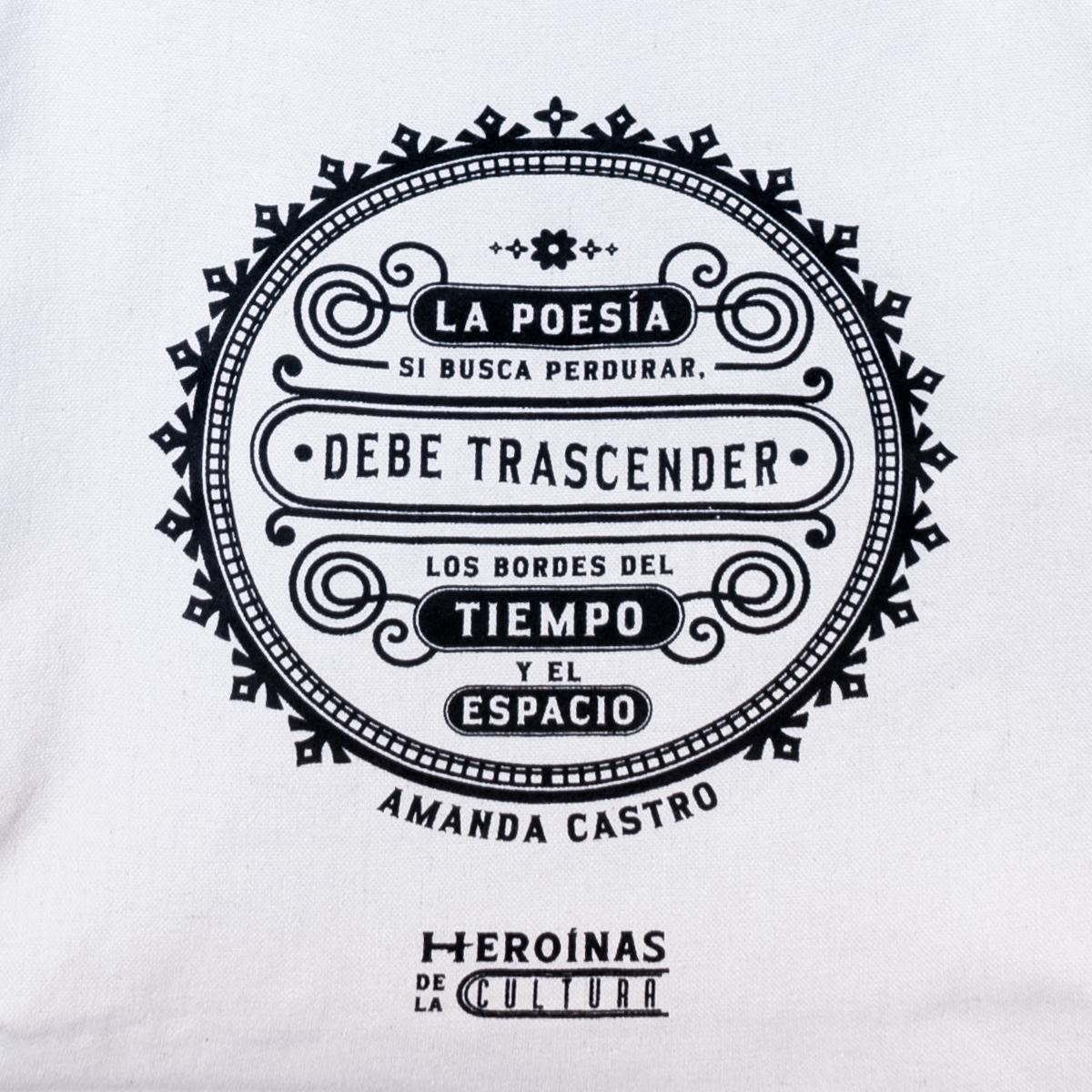 Tote bag de lino de la colección Heroínas de la Cultura. Con la frase “La poesía sí busca perdurar” de Amanda Castro, este diseño honra a una de las voces más sólidas y comprometidas de la literatura hondureña.