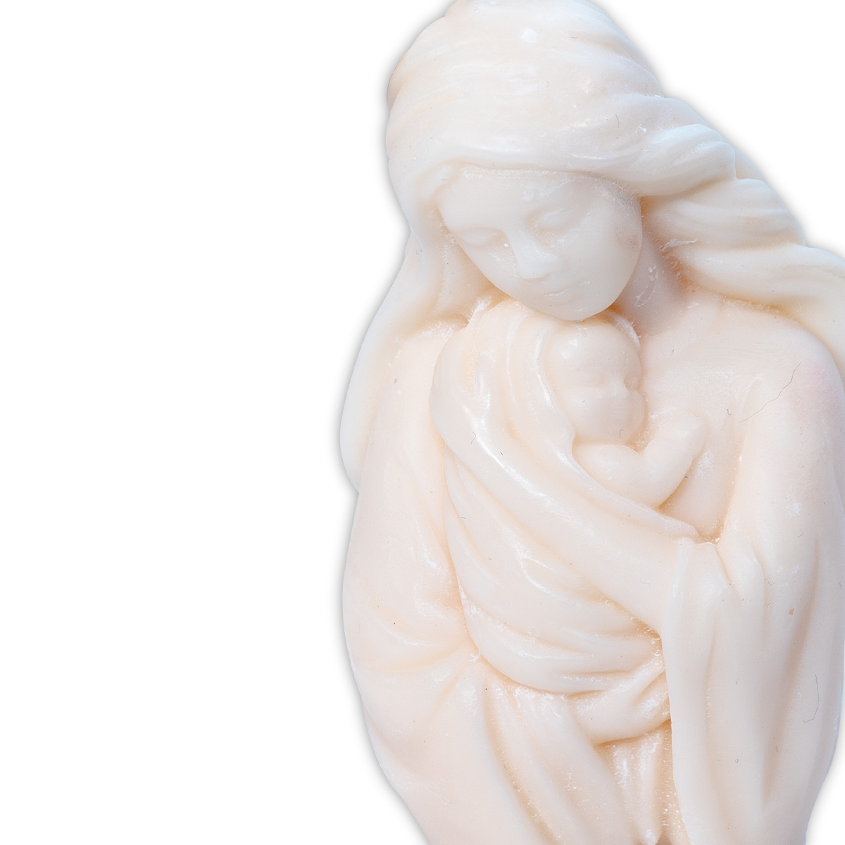Vela artesanal en forma de la Virgen con el Niño Jesús, un detalle espiritual que aporta paz, fe y un delicado aroma a tu hogar.