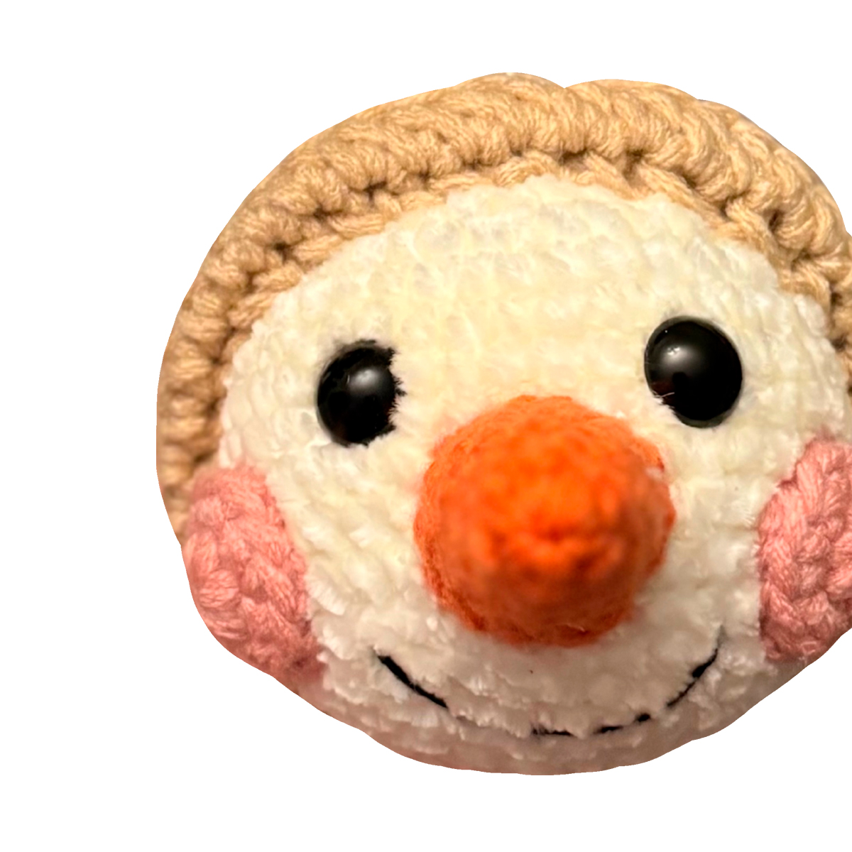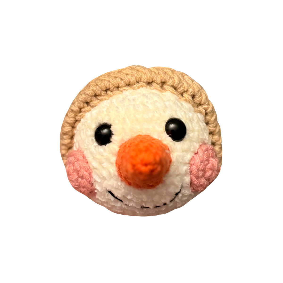 Este muñeco de nieve está elaborado con lana acrílica de alta calidad. Su diseño incluye nariz tejida en color naranja, mejillas bordadas en tono rosado y detalles bordados que realzan su expresión. Es liviano y de tamaño compacto, perfecto para colgar sin esfuerzo. Dimensiones aproximadas: 8 cm de diámetro. Incluye cordón para colgar. Hecho por Alegurumis.