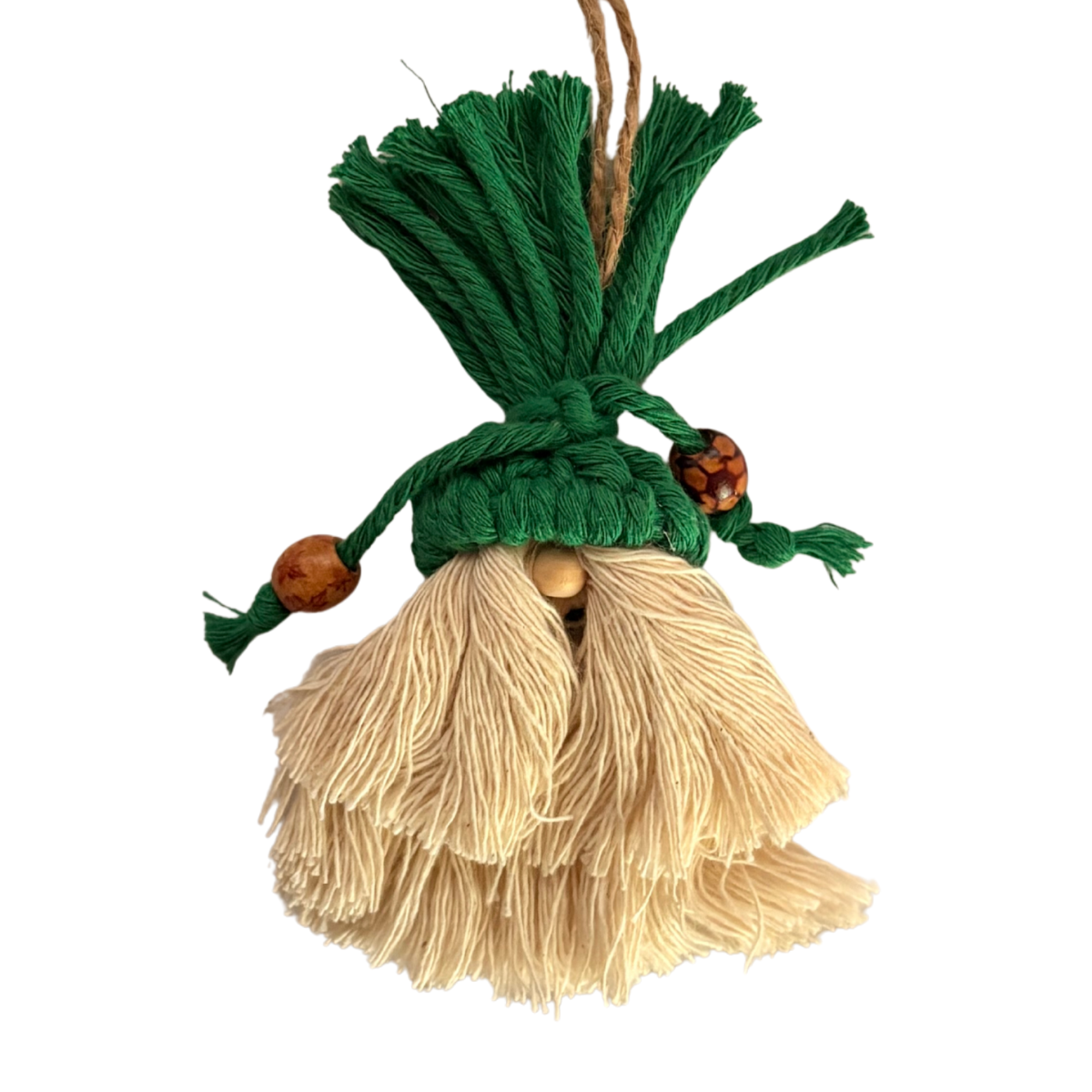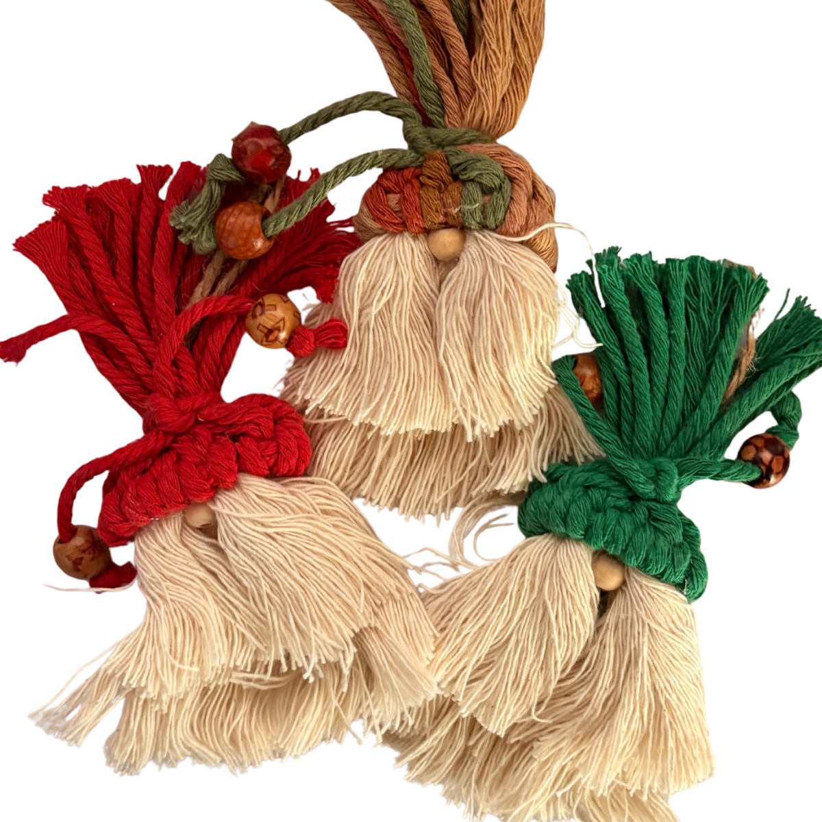 Set de 3 adornos pequeños elaborados con hilo de algodón, cáñamo y cuentas de madera. Su diseño artesanal en tonos navideños (rojo, blanco y verde) combina perfectamente con decoraciones clásicas y naturales. Ligeros y reutilizables, ideales para adornar árboles, coronas o regalos. Características: 3 unidades Material: hilo de algodón, cáñamo y cuentas de madera Tamaño aprox.: 8 cm Hecho a mano Ligeros y duraderos Hecho por Hebra.