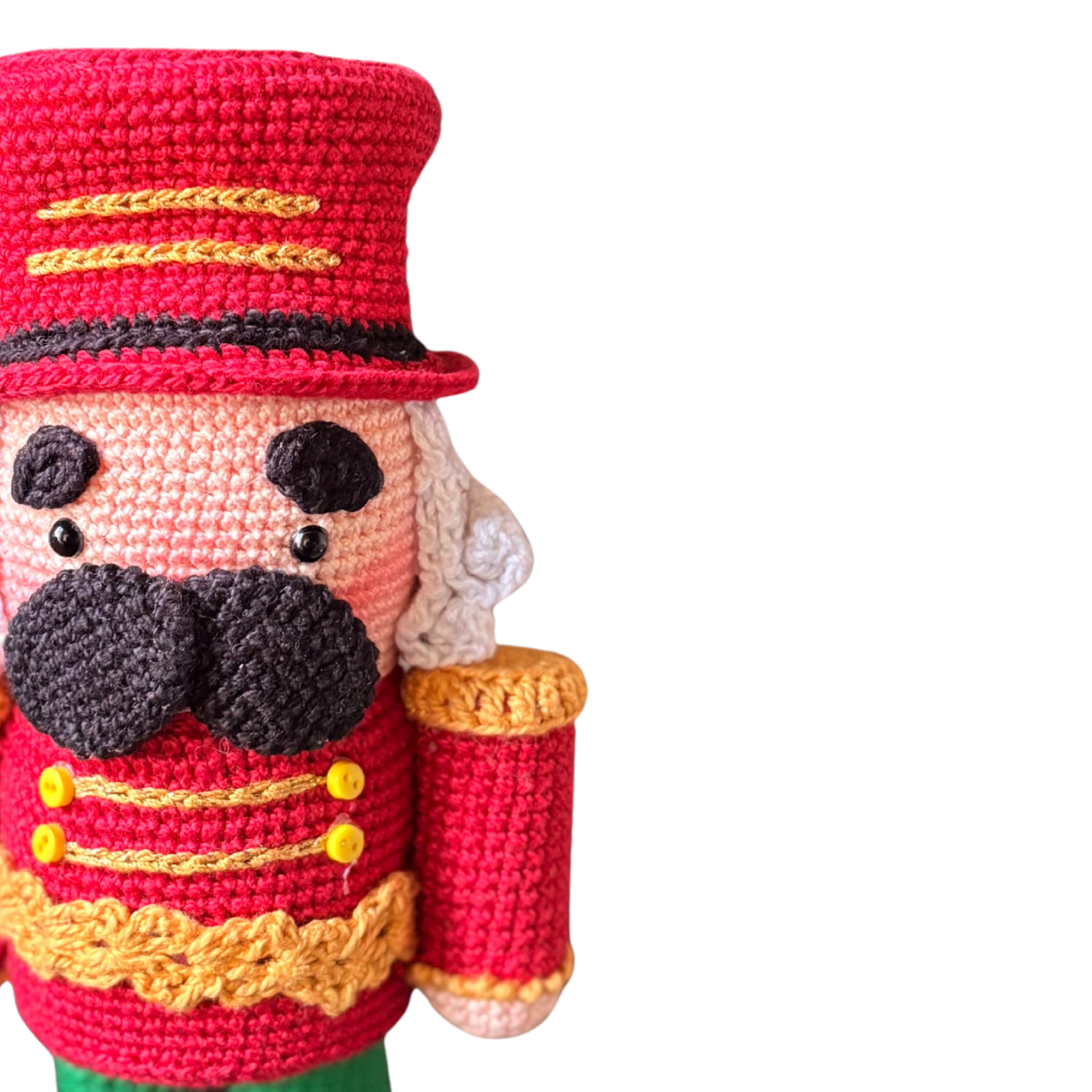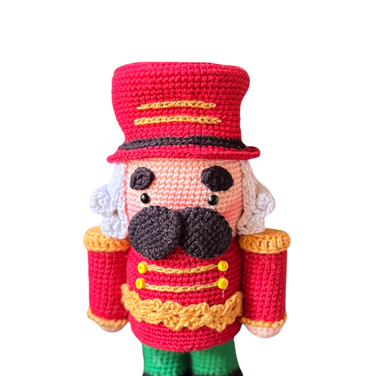 Theo el Cascanueces está elaborado completamente a mano con la técnica de crochet, utilizando hilos de algodón de alta calidad y relleno hipoalergénico. Su diseño combina tonos rojo, verde, negro y dorado,, destacando acabados precisos y costuras firmes que garantizan durabilidad y una presentación impecable. El sombrero está decorado con cordón dorado y pequeños adornos tejidos, mientras que el uniforme presenta texturas y relieves cuidadosamente trabajados. Cada pieza es única, lo que convierte a Theo en un artículo de colección ideal para decoración interior o regalo artesanal de temporada.