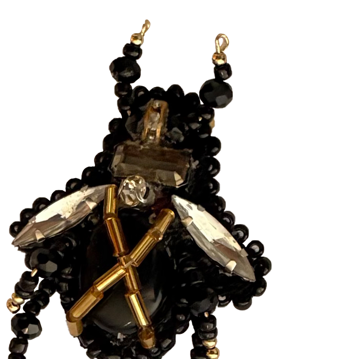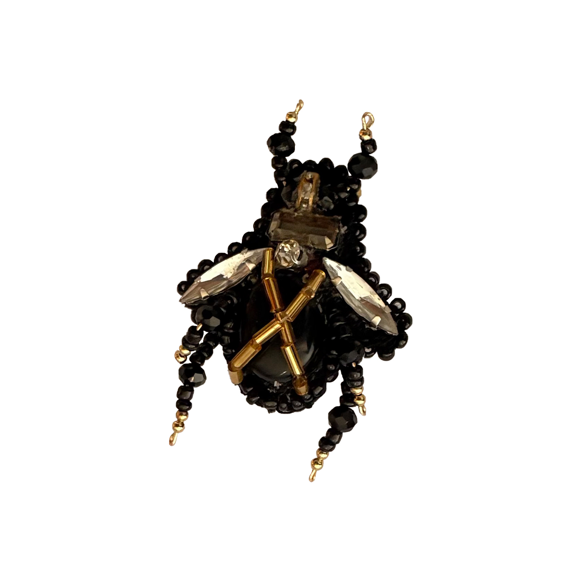 Broche bordado a mano con delicados cristales y chaquira en tonos negro y dorado. Una pieza sofisticada que transforma cualquier prenda en un acento único y elegante.